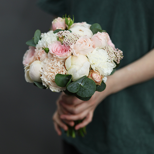 Свадебный букет диантусов, пионов, роз и озатамнуса