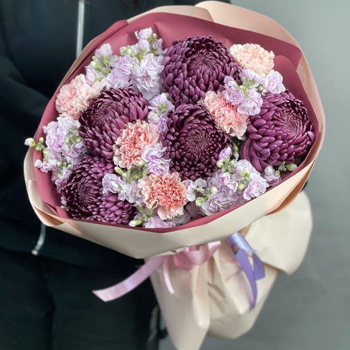 Букет "Софи" из хризантем Бигоуди, диантусов и ароматных маттиол