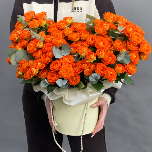 Композиция в шляпной коробке "Закат" из кустовых роз и эвкалипта